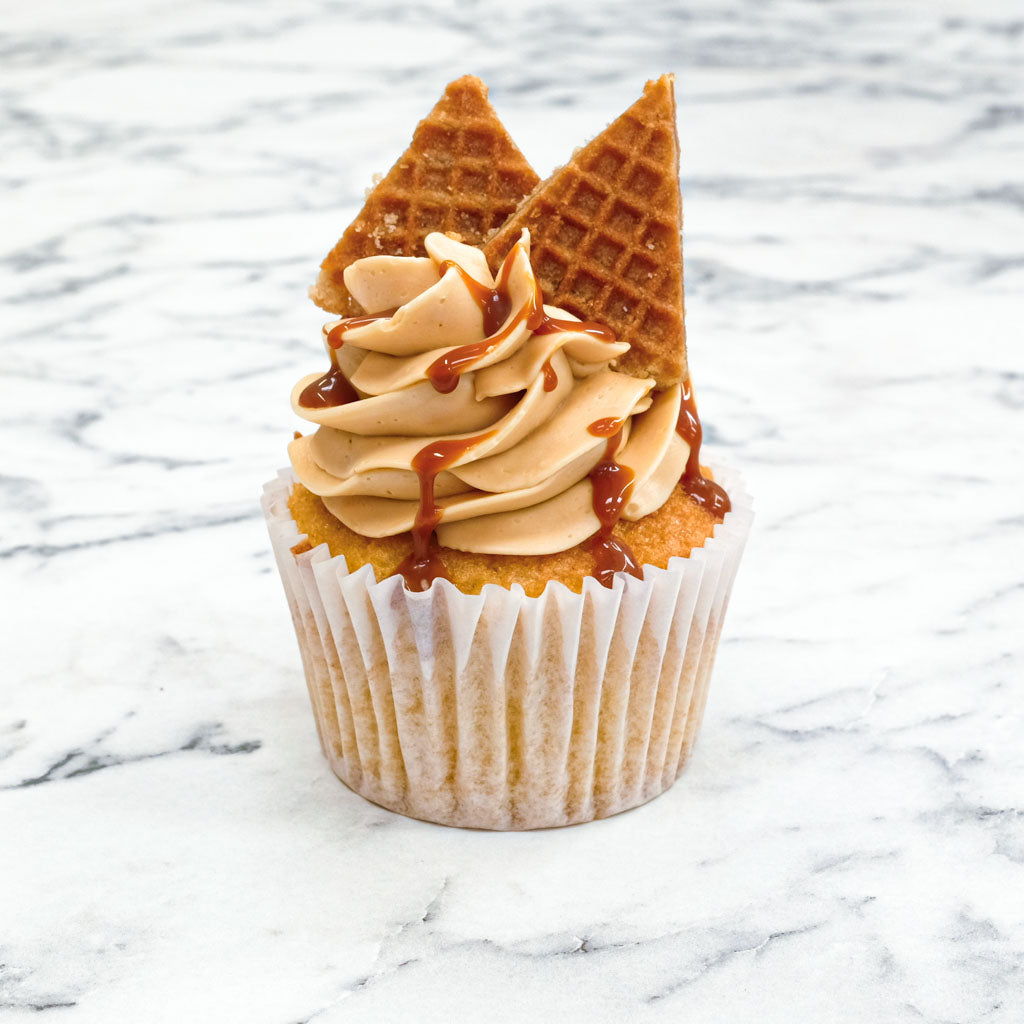 A box of our salted caramel cupcakes, made with moist vanilla sponge filled with salted caramel, topped off with salted caramel buttercream, caramel drip and a stroopwafel pieces. Made with free range organic eggs.