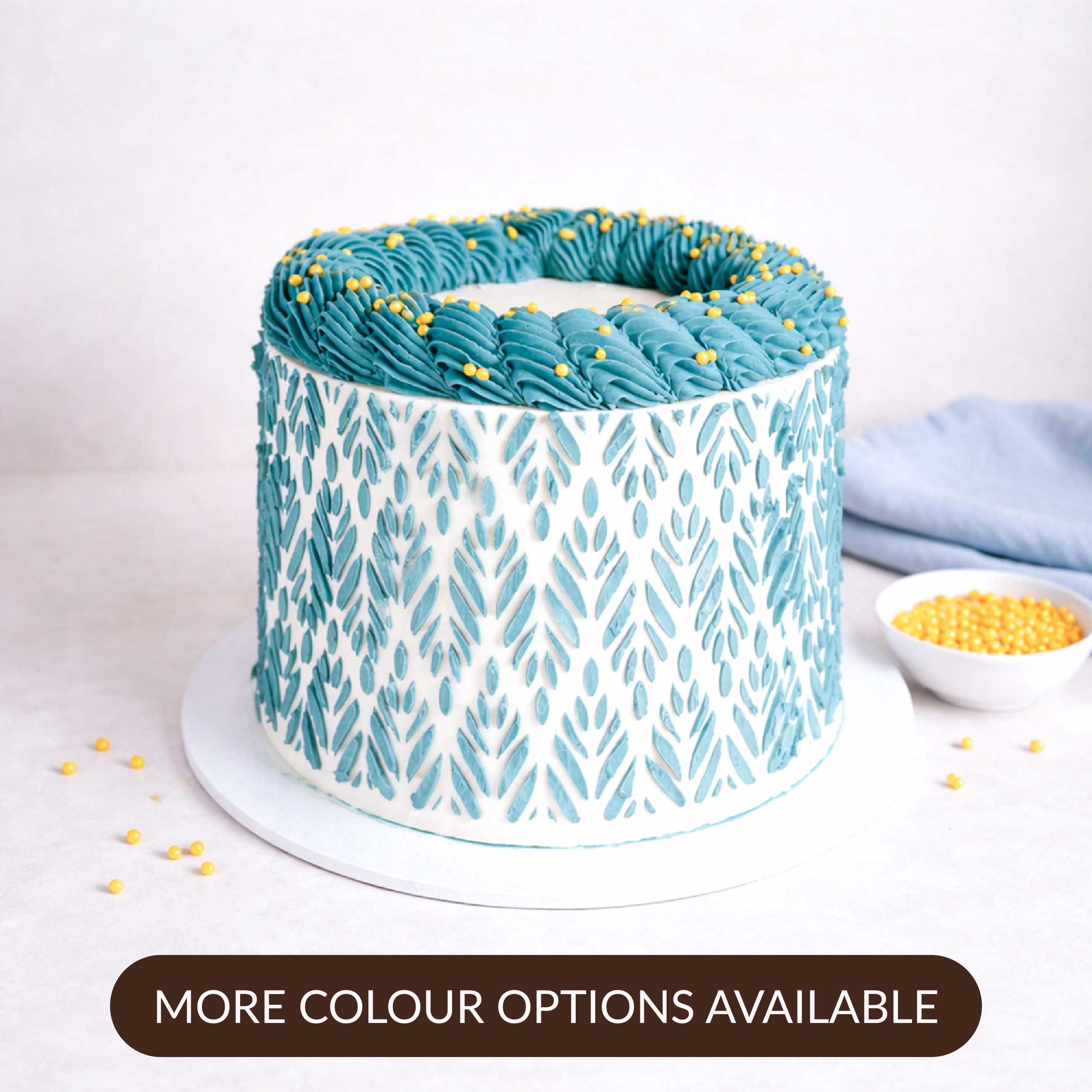 Discover the refined taste and artistry of our teal Stencil Cake by Harry Batten. This elegant creation showcases a delicate leaf-inspired stencil design, enhanced by a piped buttercream ring and subtle gold sprinkles that add a touch of sophistication. Each slice reveals alternating layers of moist, fluffy sponge and smooth, velvety buttercream, delivering a perfectly balanced flavour profile. Crafted with free-range organic eggs, this cake combines premium ingredients with expert craftsmanship. The 8" size makes it an excellent choice for celebrations across London, Sussex, and Surrey. For those requiring dietary considerations, a bespoke vegan or gluten-free version is available here.