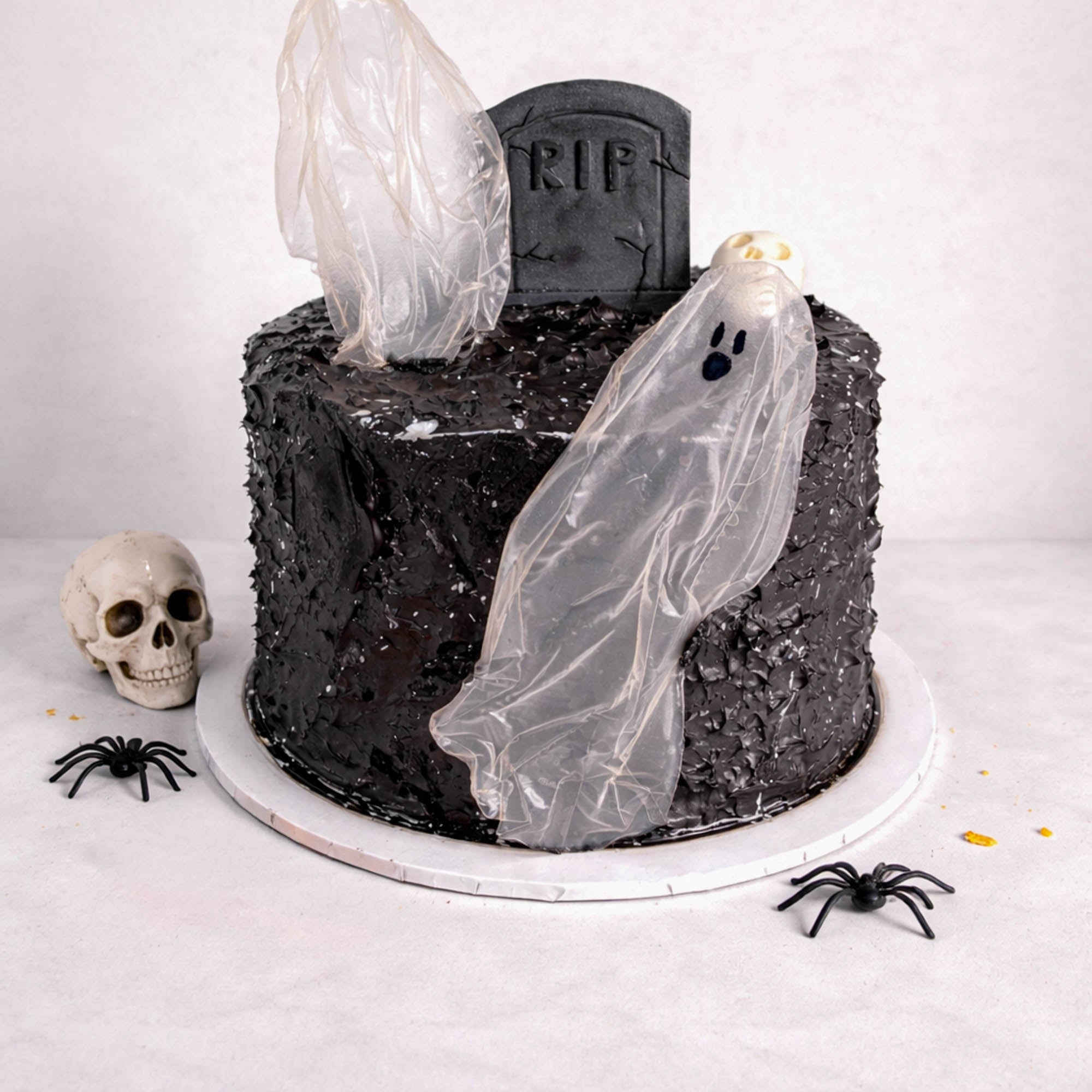 Our terrifying tombstone cake, covered with rustic black buttercream and a silver splatter. Complete with scary ghosts and a fondant tombstone and scull. With alternating layers of light fluffy sponge and silky buttercream, lots of flavours to choose from, the cake will look the same no matter which one you go for.