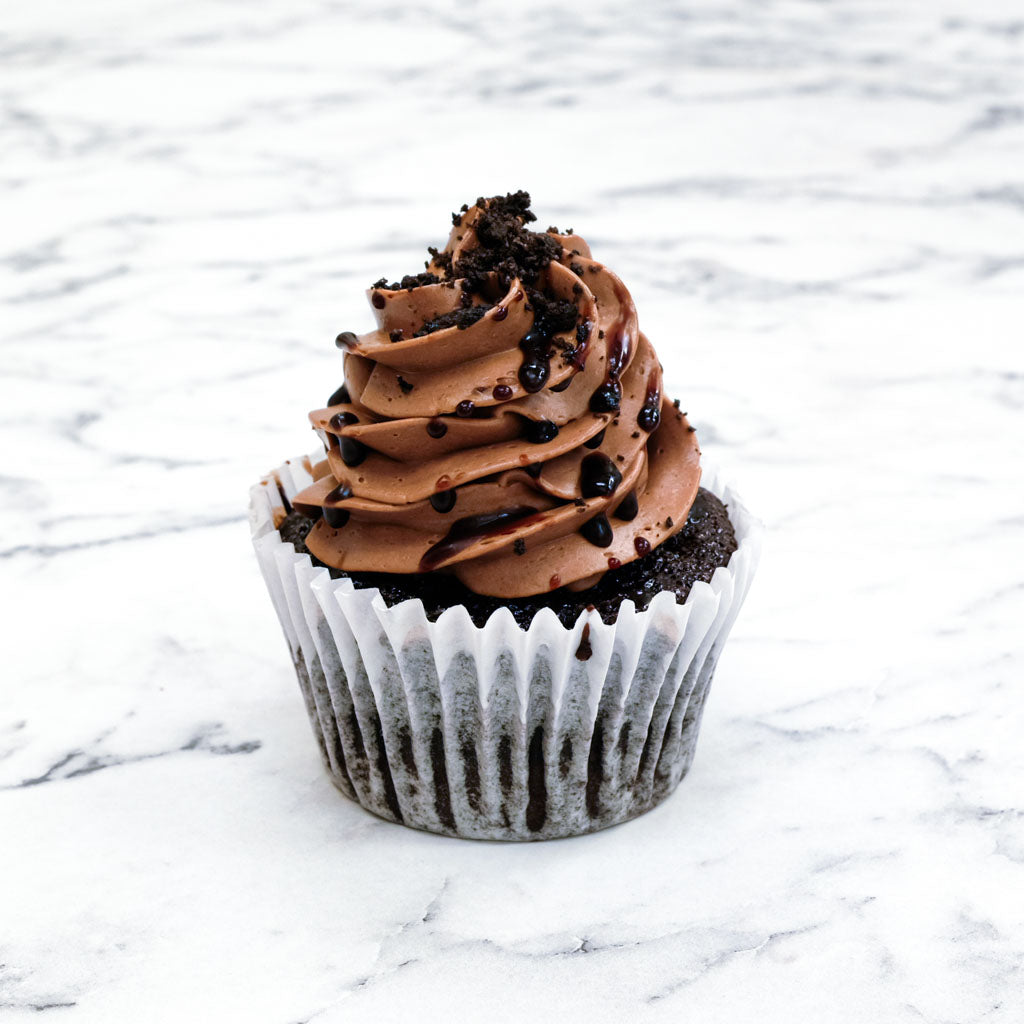 A box of our vegan & gluten friendly chocolate cupcakes, moist chocolate sponge with chocolate buttercream, topped off with chocolate sprinkles. Plant based and made without gluten containing ingredients.