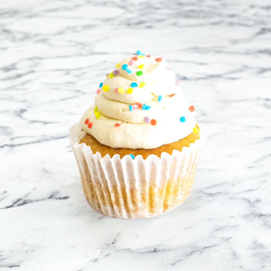 A box of our vegan vanilla cupcakes, moist vanilla sponge with silky vanilla buttercream and topped off with sugar sprinkles.